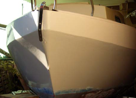 Under a carport on the northern side of the house and behind the caravan was a more recent project, a 7m trailer sailer apparently named "Catherine". This is a fairly tubby, fibreglass boat that will make a good weekender. She came to Mike via a relative who'd had a stroke. The original superstructure was removed down to the deck line and Mike has replaced it with a deck and cabin in, wait for it, Kiri.