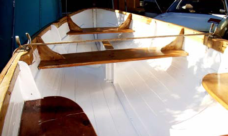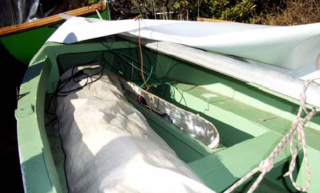 The dinghies, one of which belongs to Mike, the other to his brother, Keir, are to a design by John Gardiner, about 100 years ago. They are both strip-planked in Kiri, with double bottoms to sustain walking around. They don't weigh much at all, and given that they pre-date outboards, they row very well.