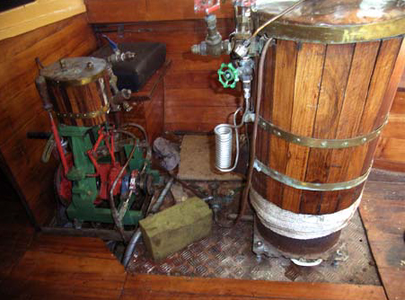 The next boat in size was the 5m day sailer. I asked Mike its name; it doesn't even have one! This is a Rogers one-off (his own design), with a single chine and a long open cockpit. The main material is, I think, Kiri again, but don't quote me. It's powered by a Windrush 14 mainsail and mast and a cut down Tornado catamaran centreboard stops it from going sideways. Mike doesn't believe in wasting things. And then we came to the Edwardian launch, "Platypus", still Mike's most impressive achievement. This boat was fully written up in September '06 and I won't repeat it all here but suffice it to say that she's also 7m long, strip planked in Kiri and powered by a steam plant of Mike's own manufacture.
