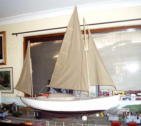 The engine is a double-acting, single cylinder with Stephenson's link reverse gear, the cylinder itself originally coming from a 7" gauge model loco. The boiler is a vertical, centre drum type with water tubes. The superstructure is open awning in the forward half with an enclosed, Windermere-style cabin aft so you can have the best of both worlds, depending on the weather. External photographs, on this occasion, were almost impossible to get due to the crowding in of other things. In the house was a scale model of the next project - a 7.3m canoe-sterned yawl, designed by Albert Strange in 1899. This sports a centreboard and broad, shallow rudder fairly typical of the NE United States. It will be a delight when finished. When? Well, not too long if Mike's previous projects are anything to go on. |