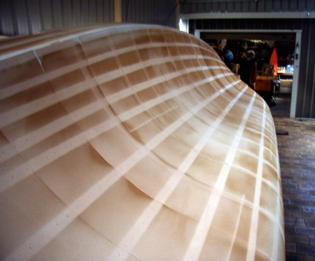 Shadowing of the foam from contact with the building jig As I said, despite the transverse placing of the foam panels the hull is going to need very little fairing-in and there were few gaps between panels. In just a few areas white Qcells made a filler with resin to fill up spaces. Brent said he's only had to do a little shaping to fit any new panel to the previous one. I guess any really small gaps will be filled with resin during the sheathing. By contrast, when I built my Victorian riverboat with 10cm wide diagonal ply planks I had to shape ("spiling" it's called) every plank from bow to stern. Most of Brent's foam was bent and laid in cold but some areas were softened with heat first which probably made it possible to accommodate compound curves where necessary. |