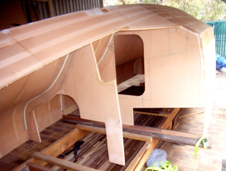 The cabin top and fore deck from the bow The resin used is epoxy, of course, specifically R80 Fibreglass International, with microballoons or Q-cells mixed where needed as a filler. The inside is sheathed with 450gsm fibreglass while 600gsm will go on the outside. There are extra layers on the inside in all areas of high stress such as outrigger hinges, winches, etc. Removing from the mould and turning over was largely a matter of muscle in Brent's case. He got several friends around and they lifted it and turned it over. It apparently only weighs 140kg in its present state anyway. I should say that handling it gently would have been the chief challenge. He also had a pair of hoisting tackles fixed to the roof of his semi open shed no doubt for minor adjustments when he's on his own. He's spent about the last two years getting to this stage but confesses the work could be done in around six months All in all it was a fascinating visit to view a large project in a medium with which none of us is too familiar. We owe a vote of thanks to Brent for making his workshop and the project available to us. |