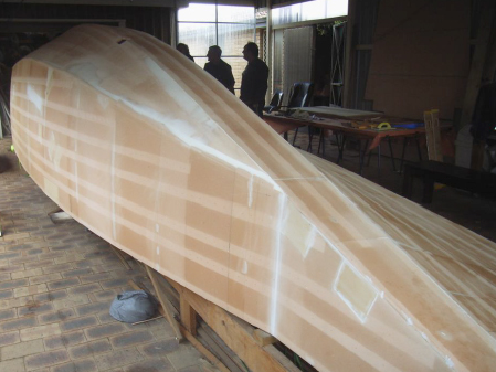 Brent has already completed the amahs, or outer hulls but I had to leave early and missed them. The foam used is Klegecell, a pinkish, fairly stiff closed-cell product which means that water won't permeate through the foam should there be a fracture in the sheathing. In this case it's 12mm thick and comes in sheets 2.4m x 1.2m. Brent has then cut the foam up into strips mostly 30cm wide, usually using a knife. These are then laid transversely around the hull, fastening where necessary with screws from the outside. I should add that for the foam version the shadows of the jig are notched frequently to allow in quite a few longitudinal stringers and giving much more opportunity for fastening screws. Harry Speight's jig doesn't have this feature because his boat is timber cored and holds its shape more naturally. Even though the 30cm panels run around the hull, the result was amazingly smooth and fair, even before cleaning up.